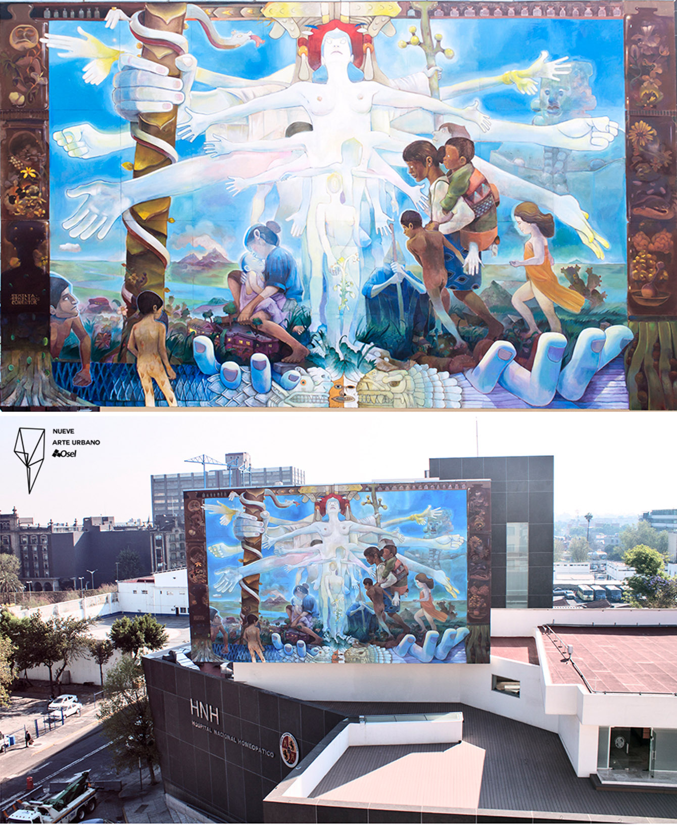 A finales del año 2013, Nueve Arte Urbano colaboró en la producción del mural del Hospital Homeopático Nacional de la Secretaría de Salud. Creado por Jesús Benítez aka DHEAR, curado por Roberto Shimizu, director del Museo del Juguete Antiguo de México (MUJAM); con el título Simila Similibus Curentur (una de las bases de la homeopatía que expresa que lo semejante se cura con lo semejante), buscando dar al hospital un mensaje positivo sobre la salud. El mural está lleno de simbolismos, siendo la figura central una representación del árbol de la vida, a través de la deidad azteca Tlazoteótl, “la comedora de suciedad” quien trae el sufrimiento y lo cura con medicina, patrona de los médicos, madre de la fertilidad y el parto.