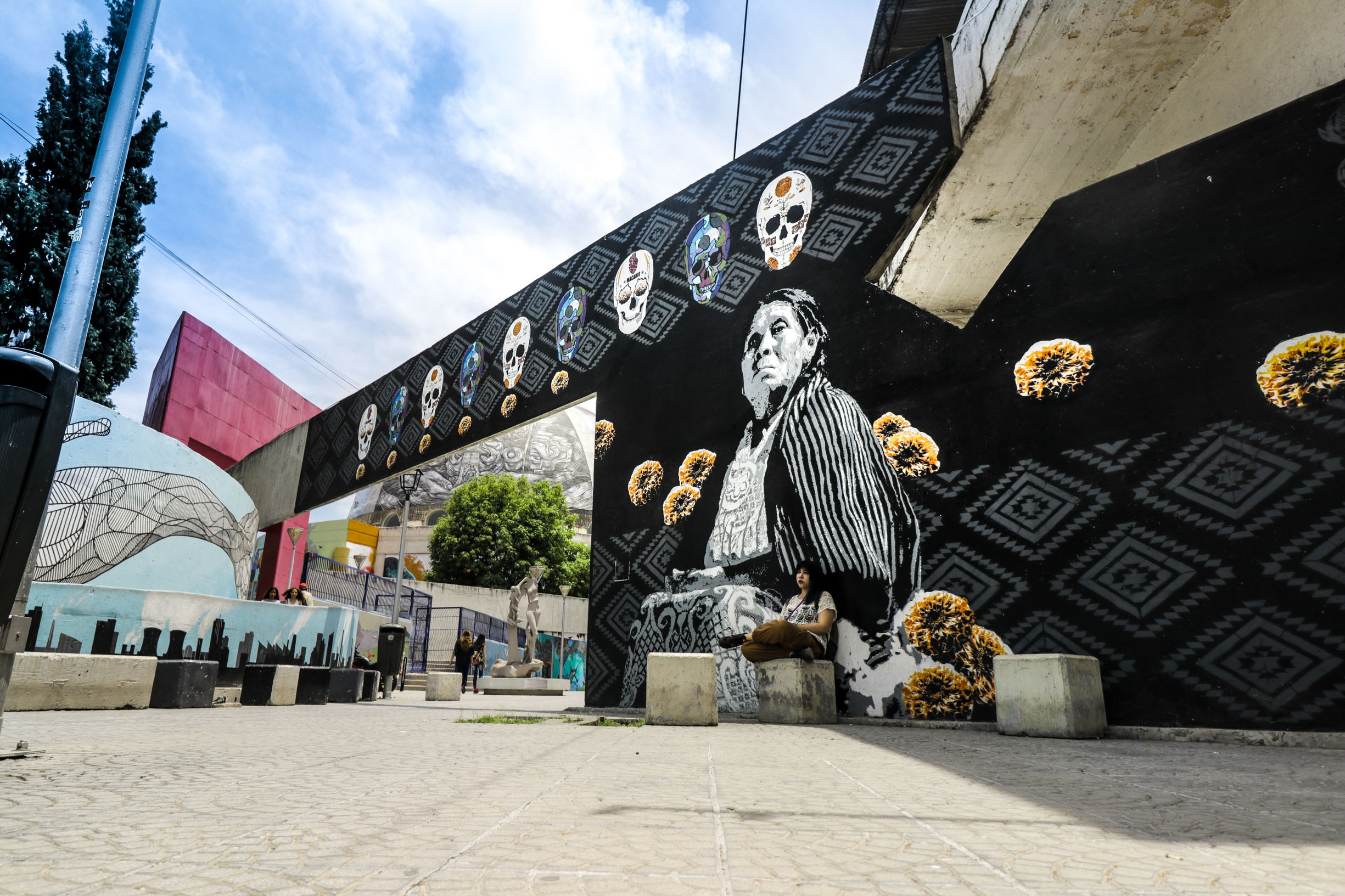 En el arco norte, el colectivo mexicano La Madriguera gráfica crea un tzompantli en el que destaca la regia figura de una mujer purépecha que honra a los dioses y a los ancestros en el día de muertos.